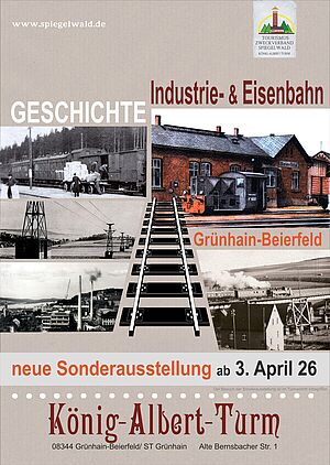 Am 02.04.26 wurde auf dem Spiegelwald eine neue Sonderausstellung eröffnet. Unter dem Titel „Industrie- und Eisenbahngeschichte Grünhain-Beierfeld“ wird mit Fotos, historischen Exponaten und Filmmaterial erzählt, was die Orte am Spiegelwald einst prägte. Eigens für die Ausstellung haben Initiator André Krüger und sein Team eine historische Modellanlage der „Alten Erzgebirgsbahn“ ertüchtigt und für Besucher wieder zugänglich gemacht. Lassen Sie sich einladen zu einem Streifzug durch sächsische Industriegeschichte. Der Besuch der neuen Sonderausstellung ist im Turmeintritt inbegriffen.