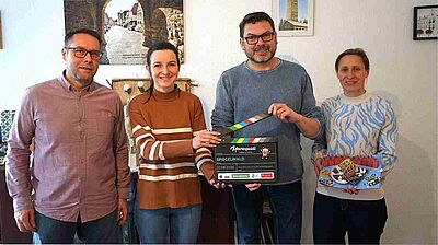 Bei einem Termin im Rathaus Beierfeld haben Vertreter des Tourismus-Zweckverband Spiegelwald im Januar 2026 ihre personalisierte Filmklappe erhalten.